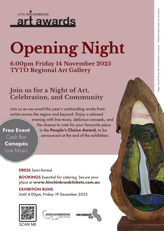 Be part of one of North Queensland’s most anticipated cultural events as we unveil the 47th Hinchinbrook Art Awards, hosted at TYTO Regional Art Gallery. This signature event celebrates creativity, talent and artistic excellence, attracting submissions from across the nation.
