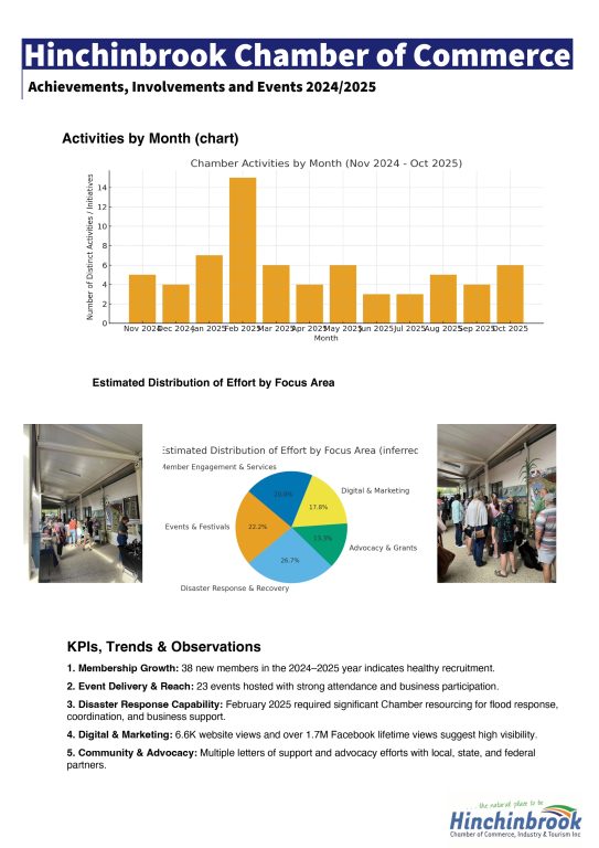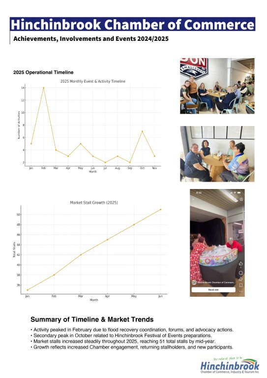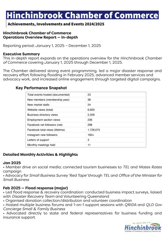 “What a Year 2025 has been for the Chamber!!!! Honestly with so much happening within the organization and the community this year, I am struggling to even know where to start!!! Members will see from the AGM report the absolute enormity of projects, advocacy and representation that Chamber has undertaken this year, however please indulge me as I would like to focus on a few of the key achievements. I will let the report speak for itself as I would like to reflect on the people who have supported the Chamber and enabled the organization to achieve all it has!! I must absolutely express my unqualified appreciation to our Chamber secretary extraordinaire Christina Spencer!!! None of what has been achieved by chamber this year would have been possible without the ever-available Christina. From the very start of the new Chamber year, Christina has been committed to implementing the vision we had to drive Chamber priorities this year, always going above and beyond to deliver!! When the floods hit in February, Christina stepped up and assisted from afar. Not only was she available to try and keep the community informed as things changed, she also made herself available to support Council and the LDMG, in any way she could. Then as soon as the immediate flooding started to retreat, she commenced a communication campaign to ascertain which businesses were open and started marketing them as well as directly liaising with GIVIT to keep them updated on where they could direct funding vouchers within the community.