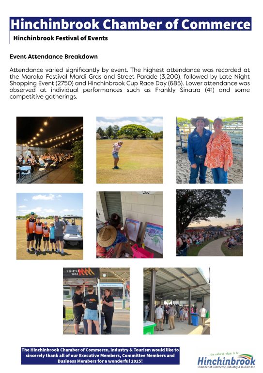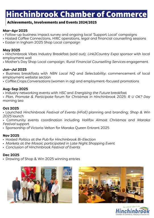 As if we had not achieved enough throughout the year in the recovery space, Chamber took the opportunity to apply for funding from Tourism and Events Queensland, to deliver the Hinchinbrook Festival of Events!!! Whilst initially we thought the biggest body of work for this project was going to be to achieve the funding to support local projects and have a budget attached to market them……until we were advised the Brisbane company originally tasked with marketing delivery, were unavailable. I cannot begin to express my absolute gratitude to Christina and her husband Chris who stepped up and took the lead on delivering this marketing campaign. I am unable to express exactly how much time, energy, commitment and vision that this dynamic team put into making this campaign a phenomenal success. With the final event for HFoE wrapping up last Thursday evening, the data collected shows over 10000 attendees have participated in these celebrations over the past six weeks. Chamber’s vision was always to enhance the existing events, to draw attendance from local and visitors to help support the local economy, as part of the recovery campaign…….and I feel we achieved that goal with outstanding results!!! I have only touched on a few of the major projects Chamber has delivered and this is over and above “business as usual”.