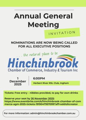 « All Events This event has passed. Hinchinbrook Chamber AGM 1 December, 2025 @ 6:00 pm - 8:00 pm « Late-Night Shopping & Markets in Hinchinbrook December Monthly Chamber Meeting » Add to calendar Google Calendar iCalendar Outlook 365 Outlook Live Details Date: 1 December, 2025 Time: 6:00 pm - 8:00 pm Event Category: Chamber Event Website: https://www.eventbrite.com/e/hinchinbrook-chamber-of-commerce-agm-2025-tickets-1919047957099?aff=oddtdtcreator Organiser The Hinchinbrook Chamber of Commerce, Industry and Tourism Inc Venue Herbert River RSL Club 4 Hawkins Street Ingham, + Google Map