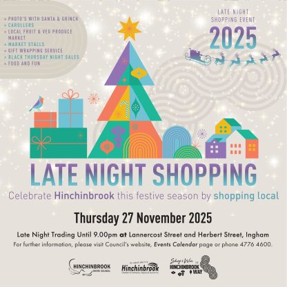 « All Events This event has passed. Late-Night Shopping & Markets in Hinchinbrook 27 November @ 5:00 pm - 9:00 pm « Almost Christmas! Community Celebration Hinchinbrook Chamber AGM » Add to calendar Google Calendar iCalendar Outlook 365 Outlook Live Details Date: 27 November Time: 5:00 pm - 9:00 pm Event Category: Council Event Organiser Hinchinbrook Shire Council Venue Ingham CBD